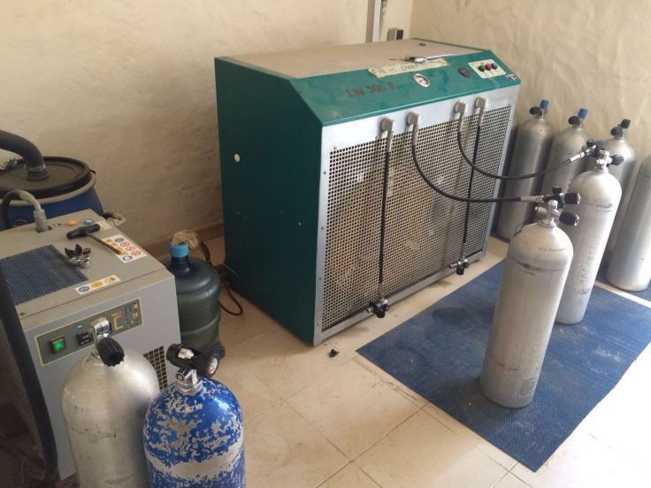 Unser Kompressorraum. Hier können wir sowohl Luft als auch Nitrox füllen.
