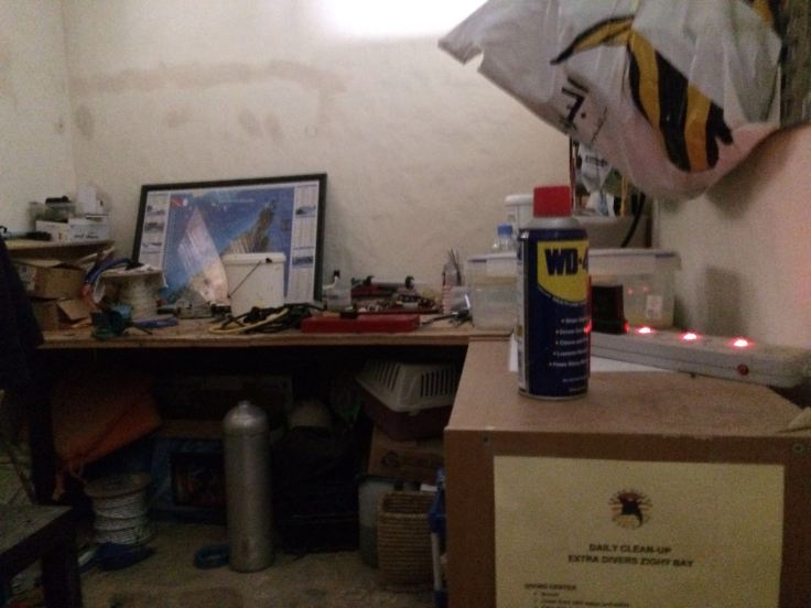 Unser Equipmentraum. Hier lagern Shortys, Anzüge, Comuter, Lungenautomaten und ABC-Ausrüstung.