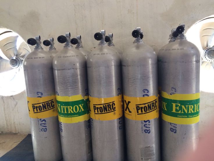 Ca. 10 Aluflaschen stehen für Nitrox und ca. 15 für Pressluft bereit. Dazu noch kleinere Tanks für Kinder.