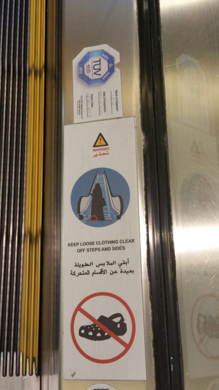 In der Mall lauern überall tödliche gefahren. Zum einen könnten wir mit unseren Burkas in der Rolltreppe hängen bleiben und zum anderen war offensichtlich der TÜV Süd mit der Abnahme der Sicherheitseinrichtungen beauftragt. Worum kümmert sich eigentlich TÜV Rheinland Nord?
