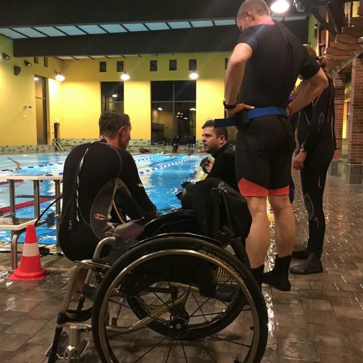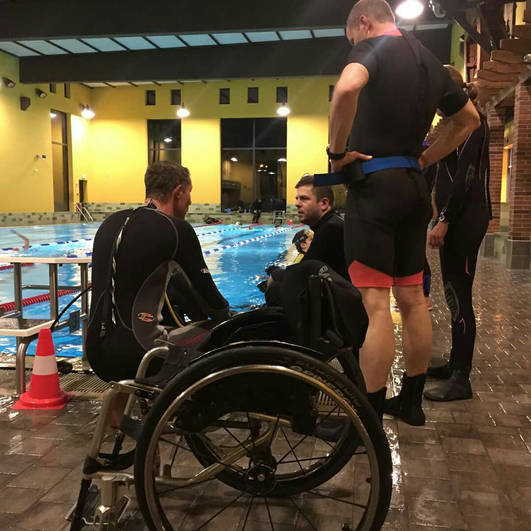 In der Praxis wurde uns dann beigebracht, wie man einen Rollstuhlfaher ins Wasser bringt, ohne den Taucher zu verletzen. Auch wie man einen behinderten Menschen die Ausrüstung anlegt und ihm die eventuelle Angst nehmen kann. Verletzungen sind bei Behinderten extrem gefährlich. Zum einen heilen diese sehr schlecht und können auch schwerwiegende Folgen nach sich ziehen. Im Wasser wurden uns dann verschiedene Tauchtechniken gezeigt. Wie man zum Beispiel nur mit den Armen und speziellen Handschuhen taucht. Sehr anstrengend übrigens. Aber auch wie man auf dem Rücken schwimmend, jemanden unter Wasser das tauchen lehrt. Wirklich nicht leicht aber nach ein wenig Übung hat es sogar Spaß gemacht. Auch diverse Ausstiegsmöglichkeiten wurden gezeigt.