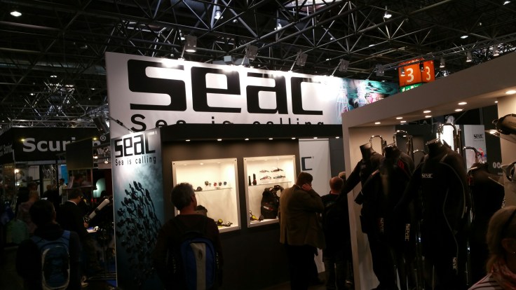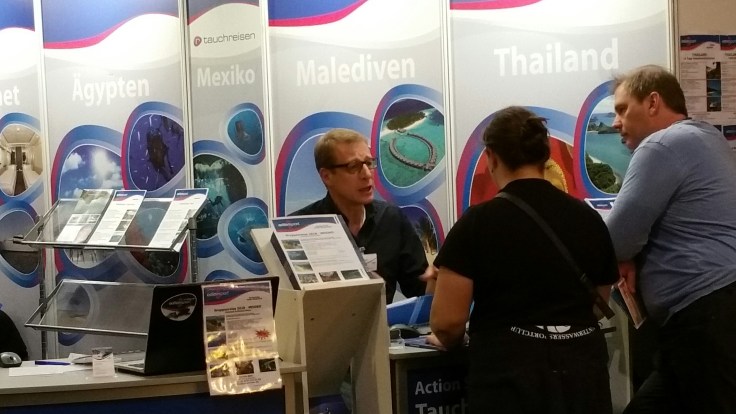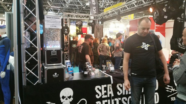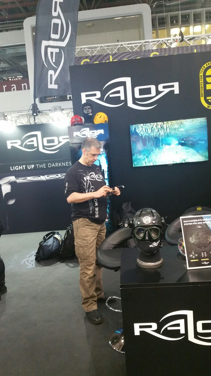 Nach einer kurzen Fahrt mit dem Shuttle Bus waren wir dann endlich in Halle 3 angekommen. Dort ist das Who is Who der Tauchbranche anzutreffen. Einen genauen Plan hatten wir nicht. Deshalb starteten wir unsere Tour ein wenig chaotisch, querbeet durch die Halle. Zuerst waren wir bei Scubapro , die nicht wirklich viel neues hatten. Aber schön mal ihre fast komplette Kollektion auf einem mal zu sehen. Weiter ging es zum PADI Stand, wir erhofften uns dort auf Thomas Sobotta (einer der zuständigen für Deutschland) zu stoßen aber der war gerade unterwegs. Also gingen wir weiter und trafen durch Zufall Martin Zeschke, Hamburgs PADI Course Director, der am Stand von RAZOR Sidemount stark beschäftigt war 😉