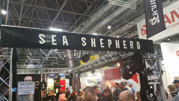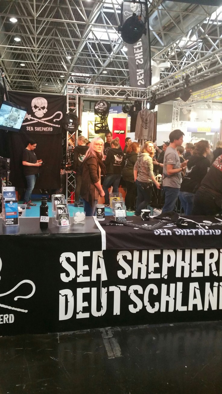 Danach ging es zu SEA SHEPHERD. nett aufgemachter Stand, natürlich mit Merchandise vollgestopft. Aber da die ja für die richtige Sache kämpfen (im Gegensatz zu Greenpeace, die imho Weichspüler sind) , kann ich das nur unterstützen. Ein paar Maskenbänder kamen mit nach Hamburg.
