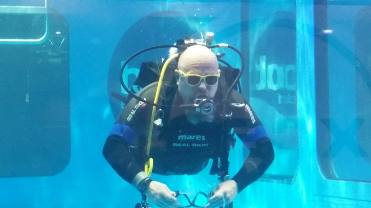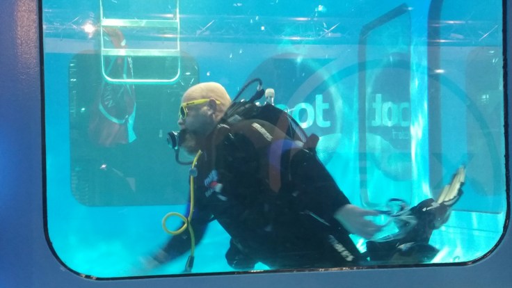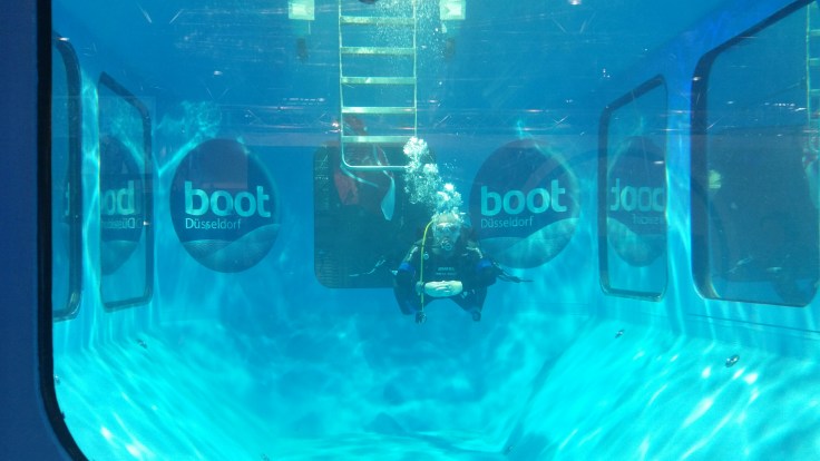 Da ich (Nils) schon länger auf RAZOR umsteigen will (es ist imho das beste SM auf dem Markt), quatschen wir noch ein bisschen, da es aber tatsächlich etwas voller wurde am Stand, werde ich mich darüber mit ihm in Hamburg nochmal in Ruhe drüber unterhalten. Ein paar Schritte weiter trafen wir dann Birgit (eigentlich auch für Tauchen Hamburg tätig) im Auftrag der BOOT am „Tauchturm“, der eigentlich ein größerer indoor Pool ist, an.