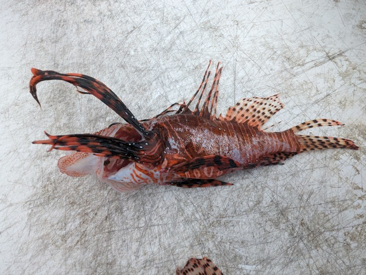Wie jagt man denn nun einen der Plagegeister? Das ist relativ leicht, denn Rotfeuerfische sind sehr schlechte Schwimmer bzw sehr langsam und auffällig noch dazu, zumindest für uns Menschen.