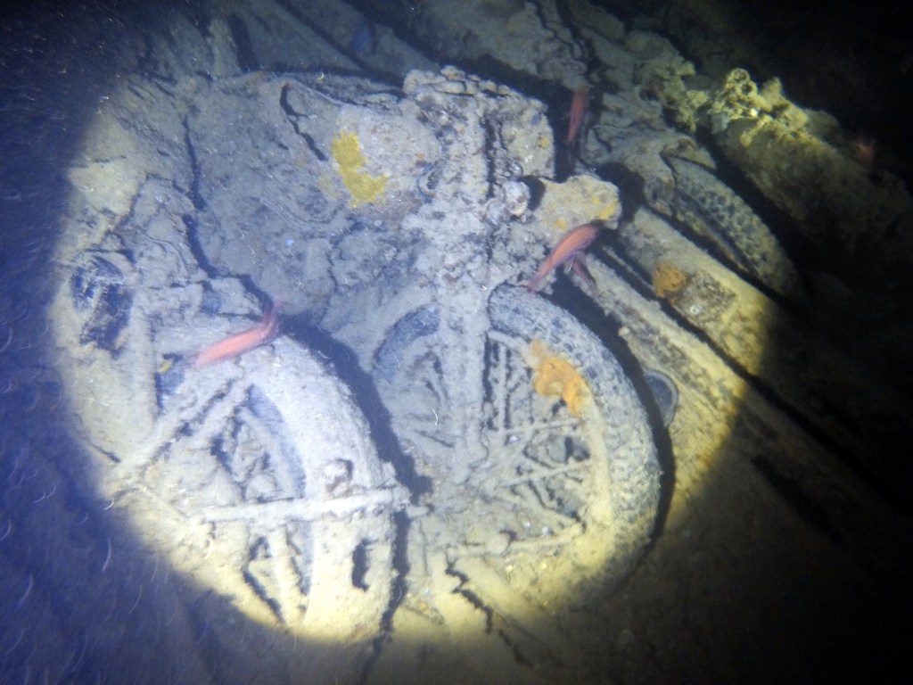 Aber auch auf dem Deck waren wichtige Kriegsgüter verstaut und durch die unglaubliche Kraft der Detonation neben das Wrack geschleudert. So waren die Eisenbahn und auch die Panzer gut zu finden.