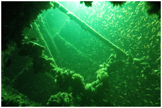 Nach knapp 15 Jahren hat sich die Natur das Wrack einverleibt und es ist sehr stark bewachsen und natürlich haben sich einige Tiere dort angesiedelt wie zum Beispiel: Seeanemonen, Seescheiden, Miesmuscheln, Krebse, Klippenbarsche, Dorsche und einige mehr!