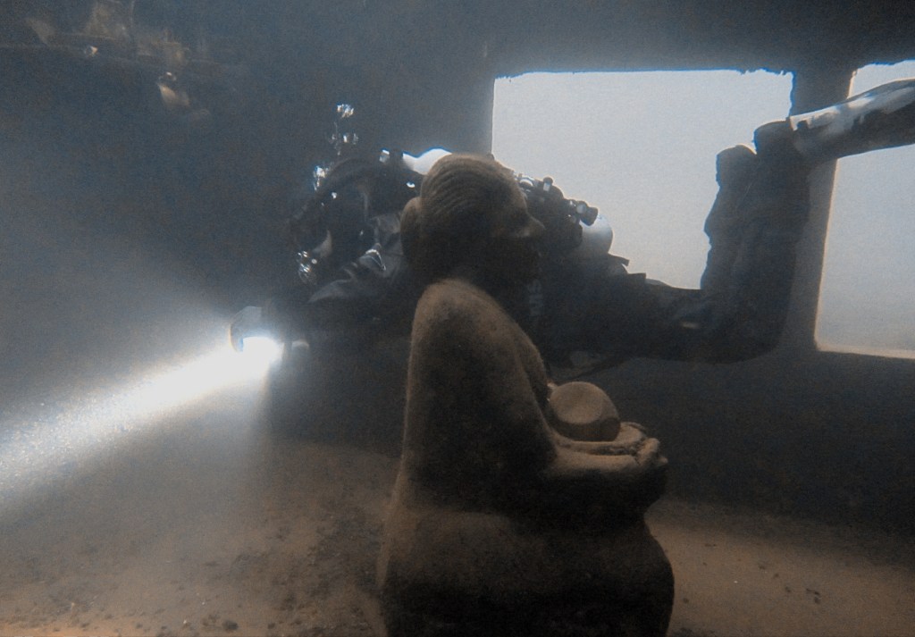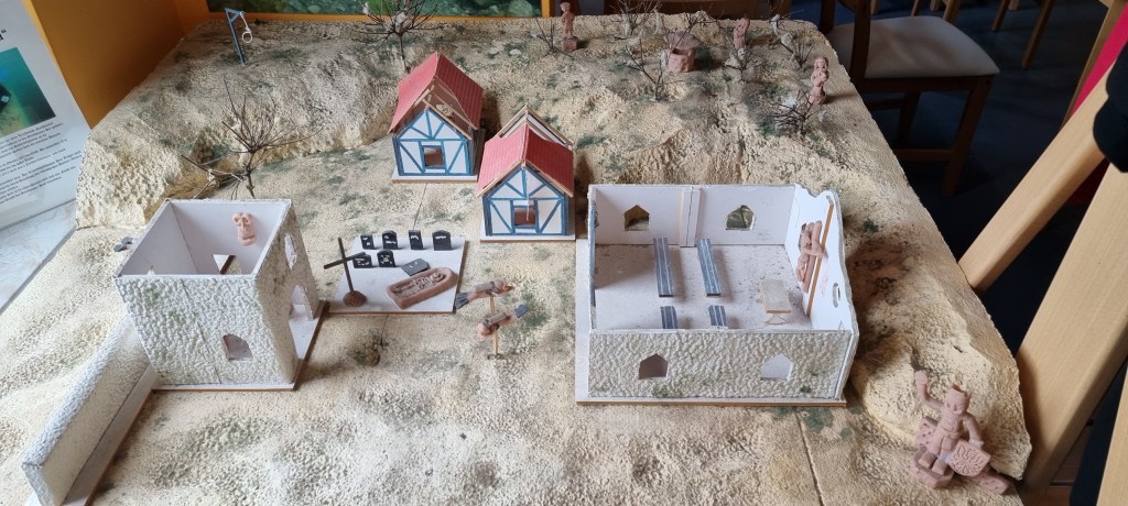 Zuerst ging es über eine Übungsplattform zu einem kleinen Wrack, dessen Bug genau in Richtung „Nordhusia“ einer (fiktiven) versunkenen Stadt zeigt.