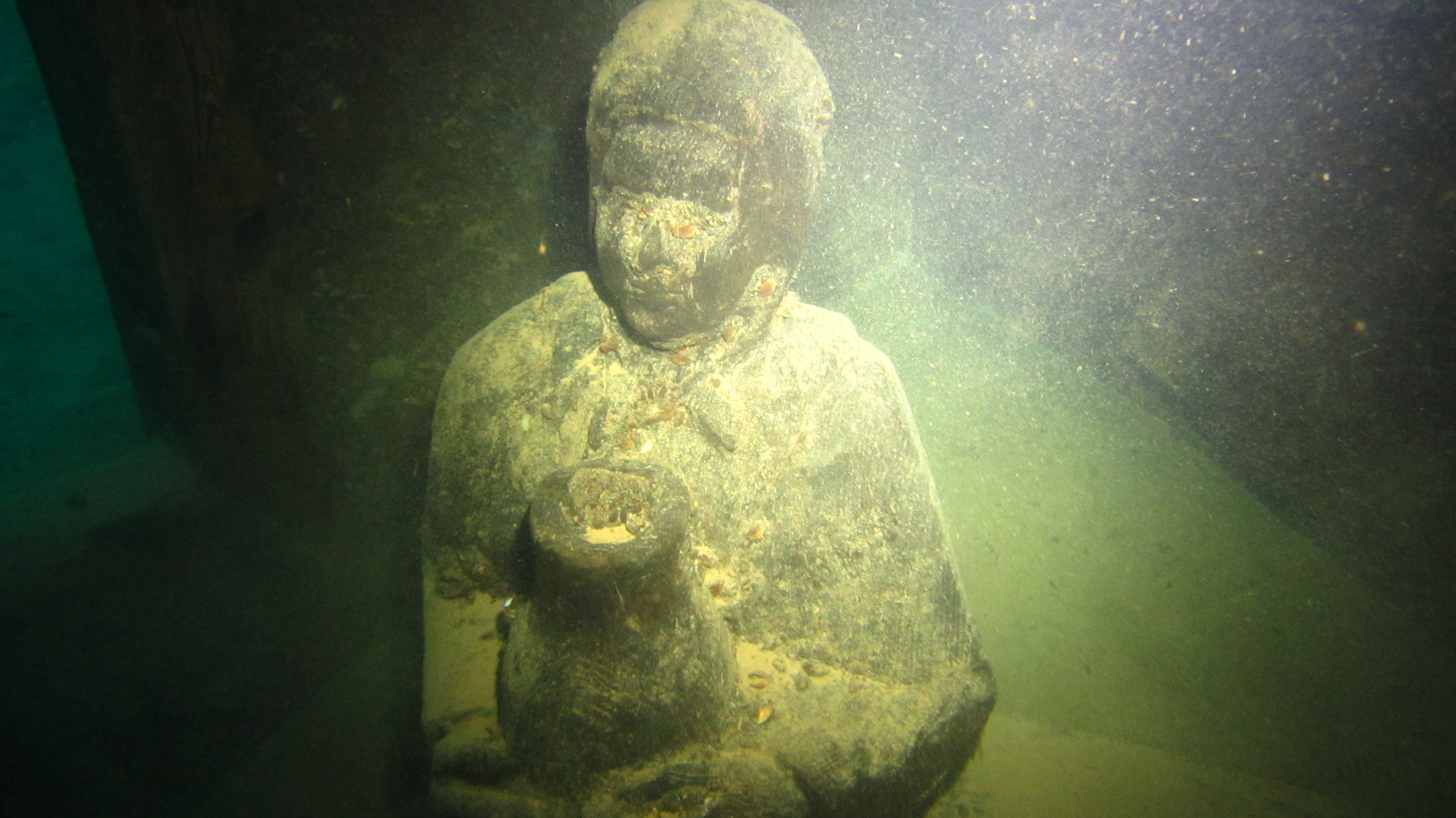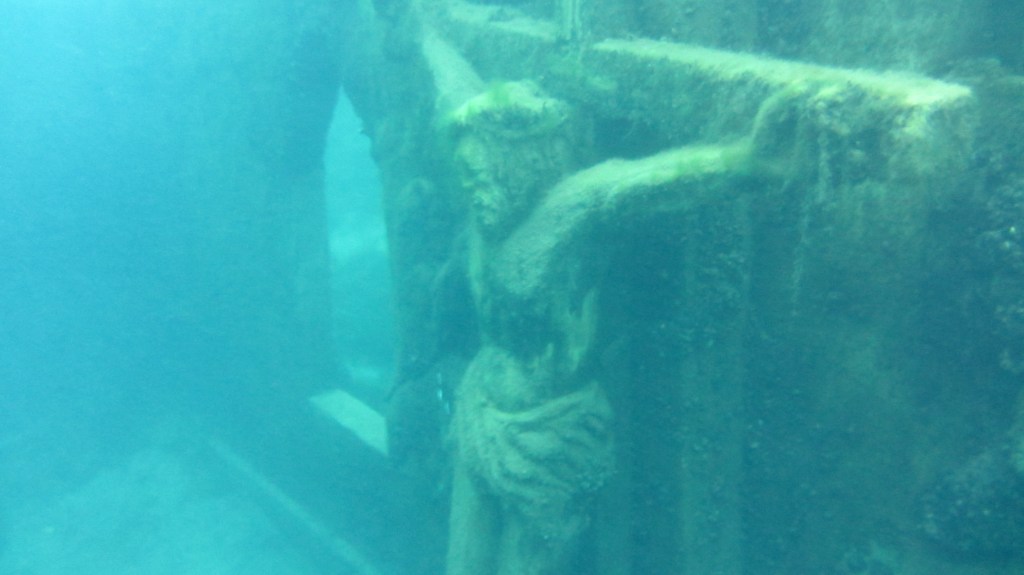Man kann eine Kirche und einen Friedhof betauchen, beides sehr liebevoll gestaltet. Wir haben an zwei Tagen 3 Tauchgänge gemacht, alle in „Nordhusia“, da es dort wirklich viel zu entdecken gibt. Man sieht jede Menge Fisch und Unmengen an Krebsen, die ziemlich groß sind.
