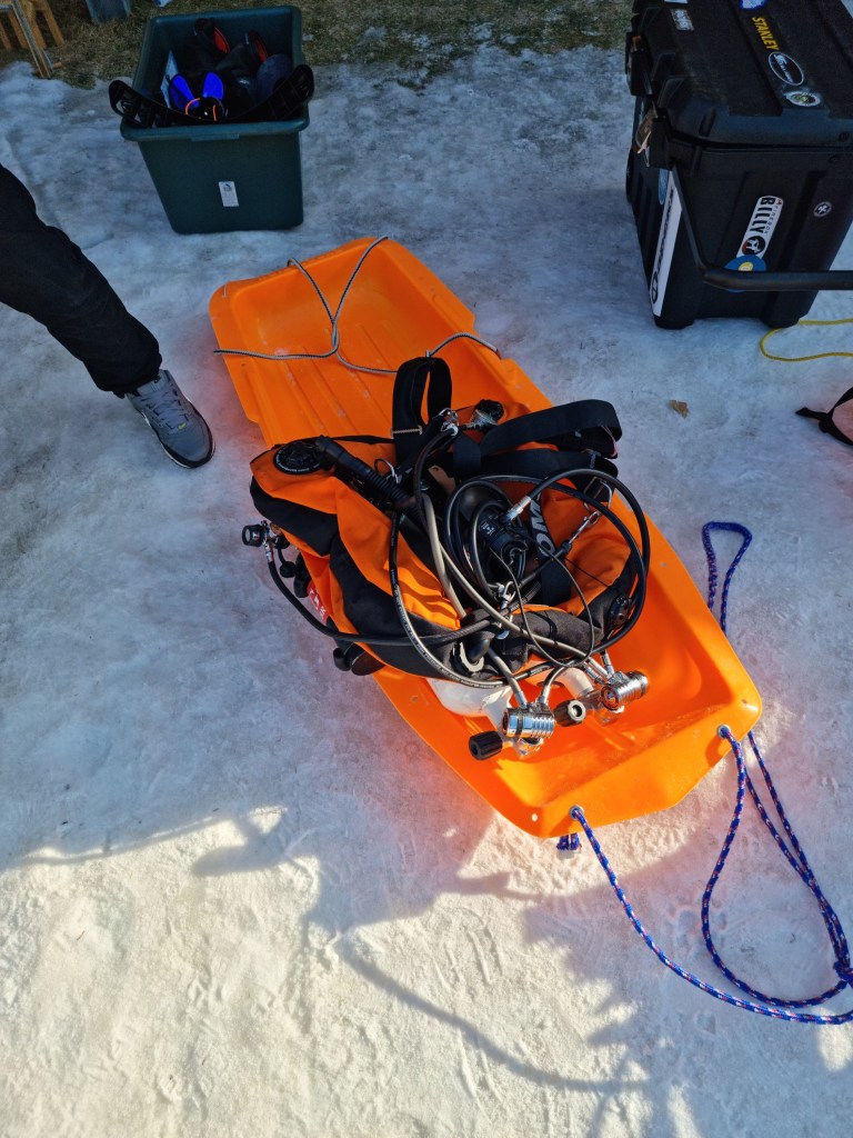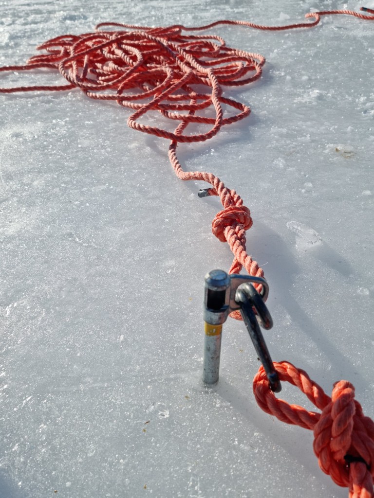 Alle Einstiegslöcher in den See waren bereits komplett vorbereitet. Die Dreiecke waren ins Eis geschnitten, Eisbohrer gesetzt, die Absperrung angebracht und natürlich waren die Sicherheitsleinen bereit zum Einsatz. Unser Equipment konnten wir mittels Schlitten oder Bollerwagen zum jeweiligen Einstiegsloch transportieren.