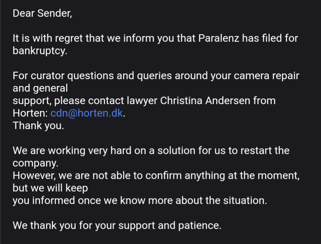 „Wie das Unternehmen auf seiner Facebook-Seite mitteilt, (Anmerkung von mir: ich kann keinen Hinweis auf der FB Seite von Paralenz finden) hat Paralenz Konkurs angemeldet. Die Website des Unternehmens scheint derzeit noch Bestellungen anzunehmen. Wie es um den Support für bestehende Besitzer bestellt ist, ist noch nicht bekannt. Unsere Gedanken sind bei den Mitarbeitern des Unternehmens und seiner Nutzergemeinschaft.
