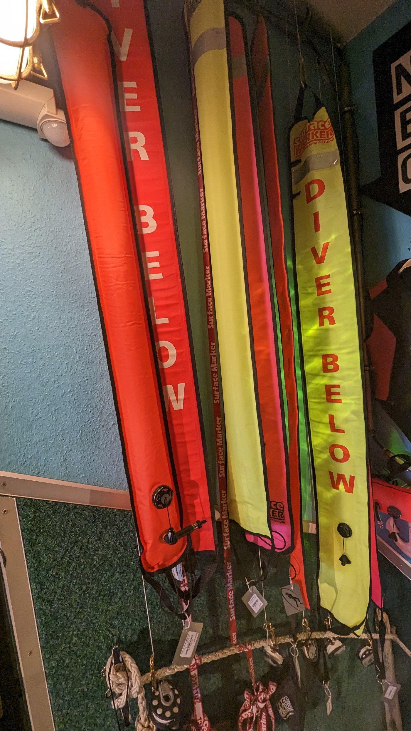 Es gibt einige Hersteller,die noch zusätzlich reflektierendes Material am oberen Ende verbauen, was zusätzlich Sicherheit bietet und Sinn macht. Auch wird manchmal eine kleine Tasche am oberen Ende vernäht, diese ist für ein großes Knicklicht gedacht, was bei Nachttauchgängen absolut Sinn macht! Dazu braucht man dann natürlich ein funktionierendes grelles Knicklicht.