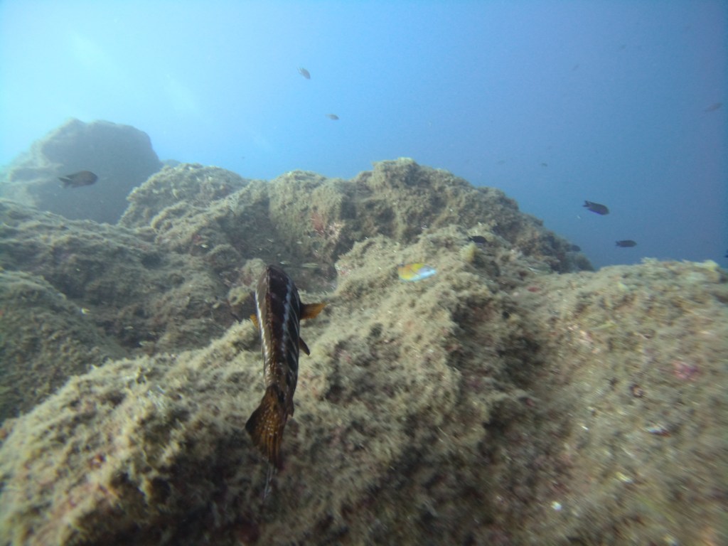 Auf den Felsen liegen unzählige Skorpionfische und Goldstriemen ziehen umher.