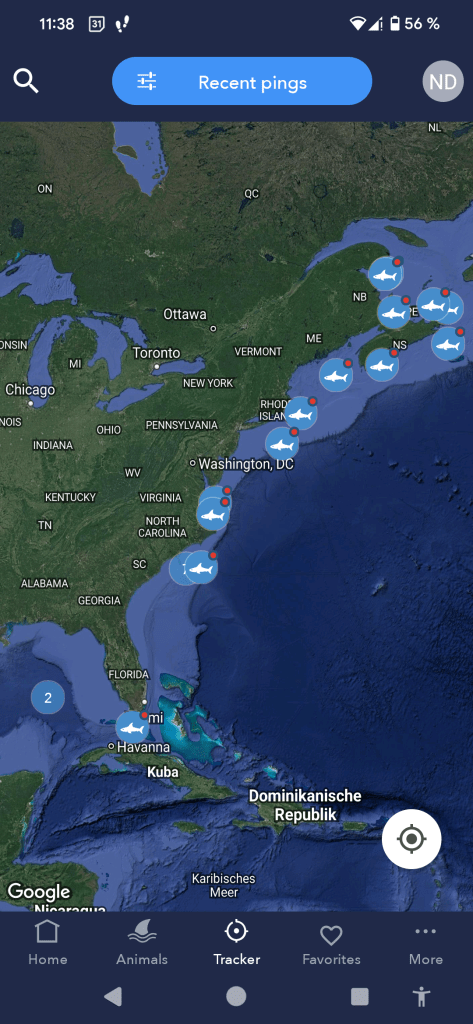 Mit dieser APP kann man Haie verfolgen „tracken“. Vor allem weiße Haie und Walhaie sind mit Sendern bestückt. Die NGO kann man durch Käufe von Shirts usw in der APP unterstützen.