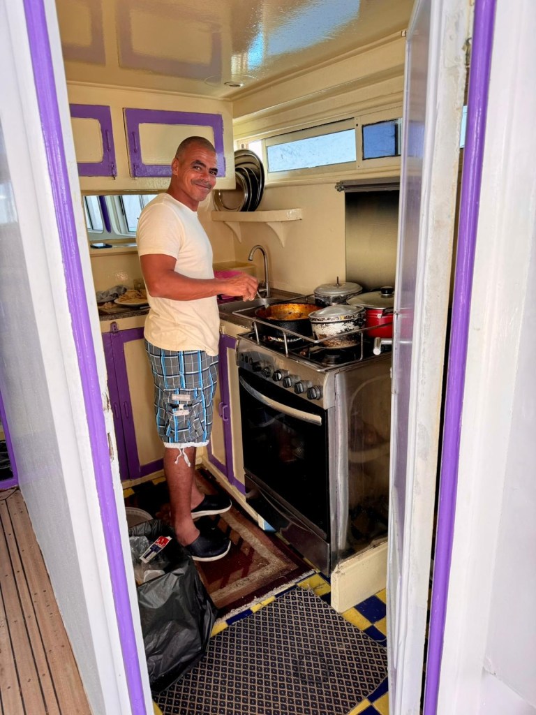 Der Koch kann in seiner vielleicht 1,5 qm großen Kombüse enorm leckeres Essen zaubern. Vom Frühstück (bei langen Tagesausfahrten) bis zum Mittagsbuffet und selbst das Backen von Kuchen ist für den Koch kein Problem.