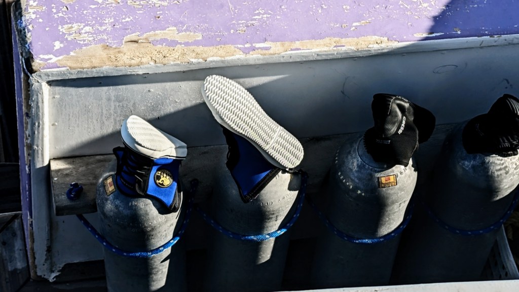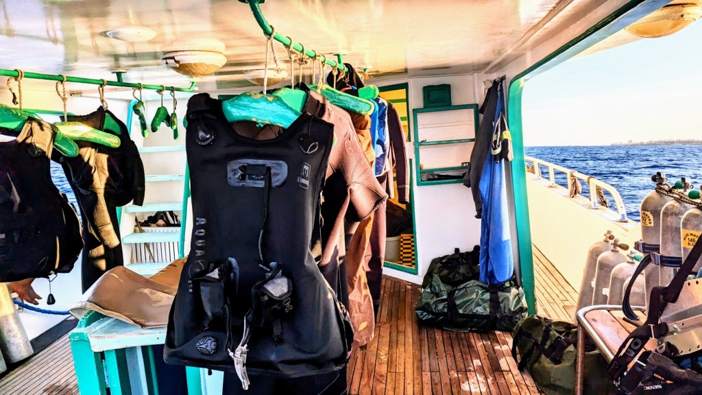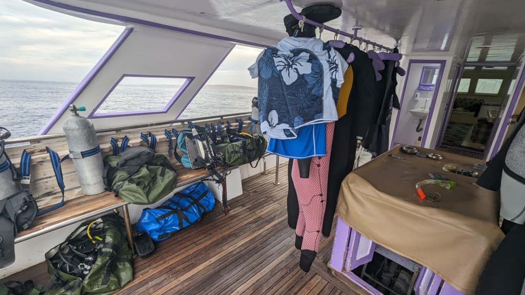 Auf dem Tauchdeck wird alles für euren Tauchgang verstaut. Es gibt immer einen Eimer mit Frischwasser für Kameras usw. Die Anzüge trocken meist komplett zwischen den Tauchgängen. Für das Aufhängen ist man natürlich selbst verantwortlich!