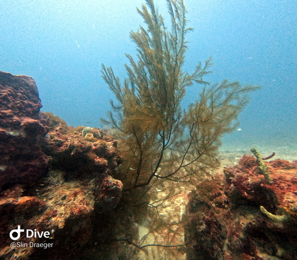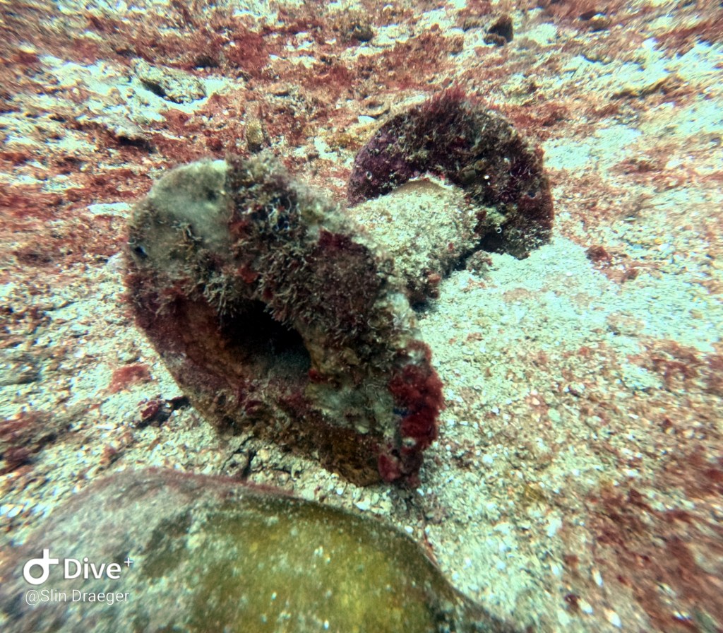 An der nördlichen Seite des Riffs findet man Kabeltrommeln und ich meine auch ein paar alte Langusten Fangkörbe gesehen zu haben. Der Schwarmfisch bewegt sich immer am Rande des Riffs und nutzt die Überhänge als Versteck falls sich Gefahr zeigt.
