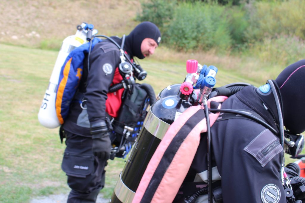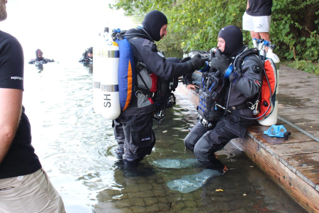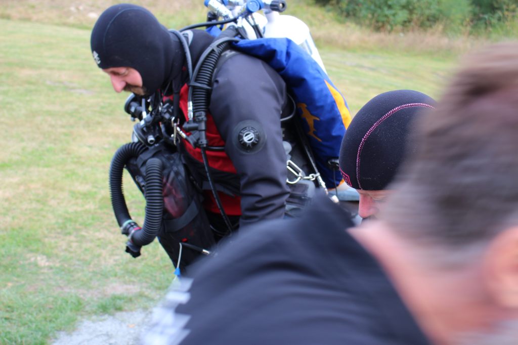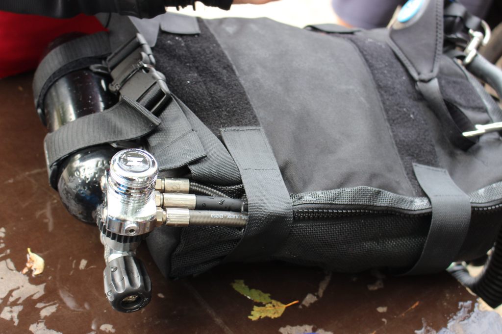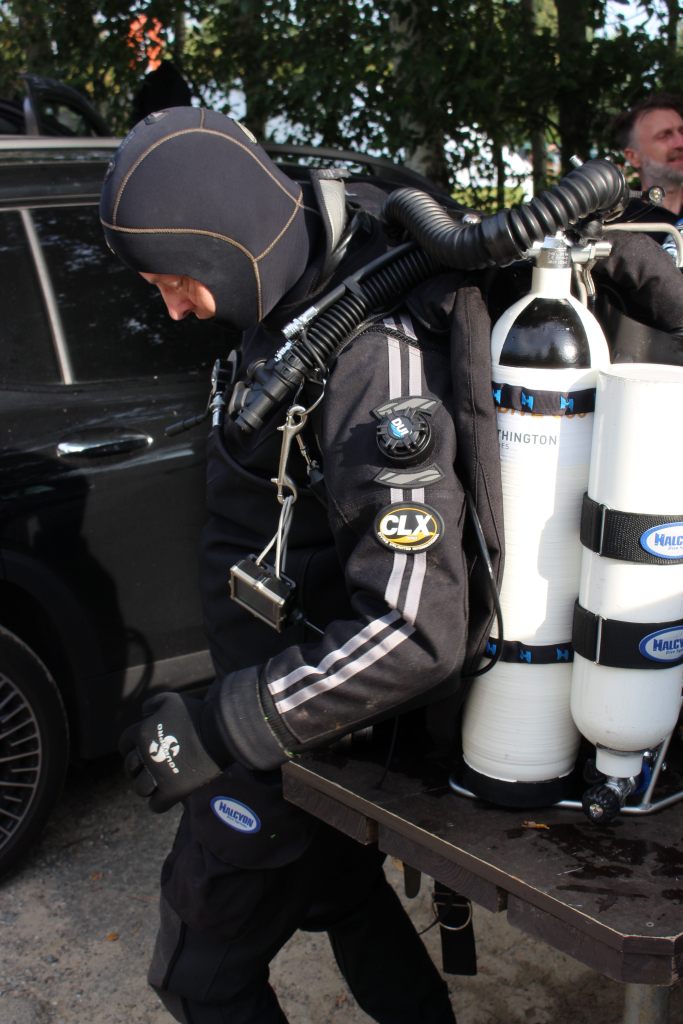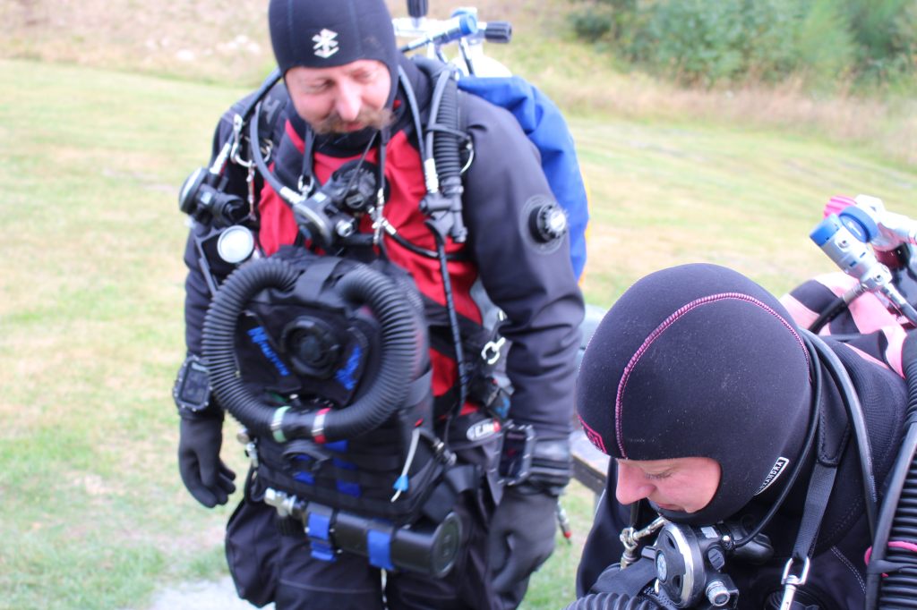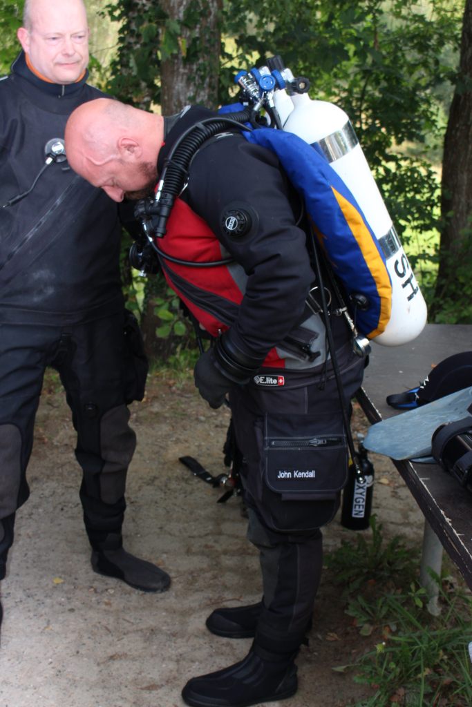 Dann machten wir uns auch schon fertig und ich hatte gar keine Zeit, aufgeregt zu sein. Als Bailout (so nennt man das Notfallatemgas) hatte ich eine Doppel 12 Backmount, da der Rebreather von Halcyon auf der Brust (Chestmount) getragen wird. Kasia half mir ins Gerät und das Feintuning übernahm John. Nach dem Bubblecheck knapp unter der Wasseroberfläche – hier wird nach Leckagen gesucht – ging es dann los.
